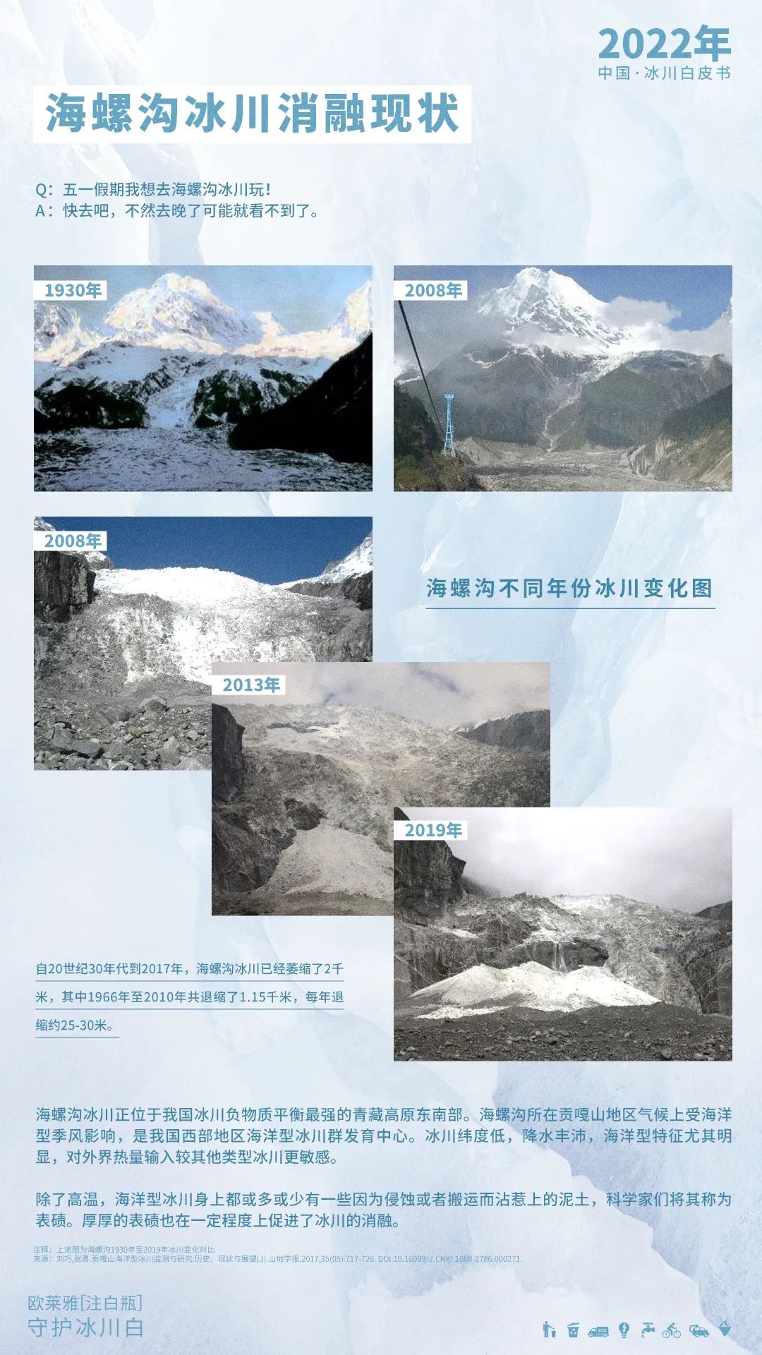 青藏高原海螺溝冰川消融現(xiàn)狀。來自騰訊新聞&中華環(huán)境保護(hù)基金會&巴黎歐萊雅:《“守護(hù)冰川白”:2022中國冰川白皮書》