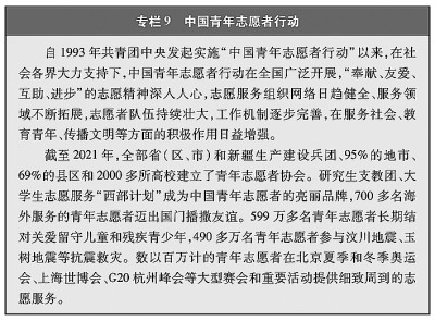 無(wú)論在城鎮(zhèn)還是鄉(xiāng)村、企業(yè)還是學(xué)校,青年都自覺(jué)把正確的道德認(rèn)知、自覺(jué)的道德養(yǎng)成、積極的道德實(shí)踐緊密結(jié)合起來(lái),帶頭倡導(dǎo)向上向善社會(huì)風(fēng)氣、塑造社會(huì)文明新風(fēng)尚。在城鄉(xiāng)社區(qū)建設(shè)中,越來(lái)越多的青年投身社區(qū)治理和服務(wù)體系建設(shè),主動(dòng)參加“社區(qū)青春行動(dòng)”,加強(qiáng)實(shí)踐鍛煉、提升服務(wù)貢獻(xiàn)。在各行各業(yè),青年秉承“敬業(yè)、協(xié)作、創(chuàng)優(yōu)、奉獻(xiàn)”的理念,踴躍創(chuàng)建“青年文明號(hào)”,大力弘揚(yáng)新時(shí)代職業(yè)文明,展現(xiàn)新時(shí)代職業(yè)形象。廣大青年運(yùn)動(dòng)員弘揚(yáng)體育道德風(fēng)尚,以良好的賽風(fēng)賽紀(jì)和文明禮儀,獲得競(jìng)技成績(jī)和精神文明雙豐收。1993年“中國(guó)青年志愿者行動(dòng)”啟動(dòng)以來(lái),志愿服務(wù)成為青年參與社會(huì)治理、履行社會(huì)責(zé)任的一面旗幟,成為青年在奉獻(xiàn)人民、服務(wù)社會(huì)中鍛煉成長(zhǎng)的重要途徑。截至2021年底,全國(guó)志愿服務(wù)信息系統(tǒng)中14歲至35歲的注冊(cè)志愿者已超過(guò)9000萬(wàn)人,他們活躍在社區(qū)建設(shè)、大型賽事、環(huán)境保護(hù)、扶貧開發(fā)、衛(wèi)生健康、應(yīng)急救援、文化傳承等各個(gè)領(lǐng)域,弘揚(yáng)“奉獻(xiàn)、友愛(ài)、互助、進(jìn)步”的志愿精神,在全社會(huì)形成團(tuán)結(jié)互助、平等友愛(ài)、共同前進(jìn)的新風(fēng)尚。中國(guó)青年志愿者扶貧接力計(jì)劃研究生支教團(tuán)、大學(xué)生志愿服務(wù)“西部計(jì)劃”連續(xù)18年派遣41萬(wàn)余名研究生、大學(xué)畢業(yè)生,到中西部2100多個(gè)縣(市區(qū)旗)開展扶貧支教、衛(wèi)生醫(yī)療等志愿服務(wù)。青年始終是大型賽會(huì)志愿服務(wù)的主體力量,給千家萬(wàn)戶乃至全世界留下深刻印象。