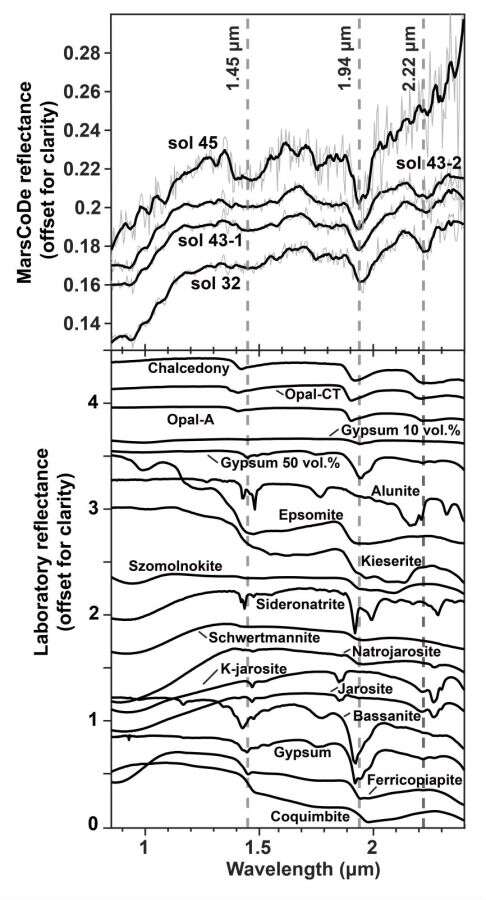 劉洋研究員和合作者通過對祝融號(hào)火星表面成分探測器獲取的短波紅外光譜和導(dǎo)航與地形相機(jī)數(shù)據(jù)進(jìn)行分析,發(fā)現(xiàn)了一種形貌上類似沉積巖的巖石類型——板狀的亮色巖石。這些板狀巖石通常部分被灰塵和土壤覆蓋,顯示出剝落的表面,表明受到熱應(yīng)力和風(fēng)成作用的物理風(fēng)化。研究人員利用短波紅外光譜在這些亮色板狀巖石中探測到了之前軌道數(shù)據(jù)在該區(qū)域沒有識(shí)別到的含水礦物,這些光譜具有~1.9μm和~2.2μm吸收特征,推測其為含水硅或含水硫酸鹽。