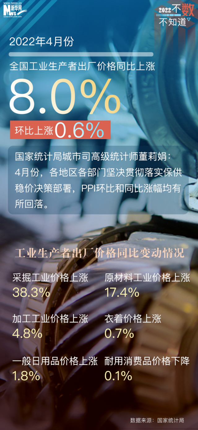從全國(guó)工業(yè)生產(chǎn)者出廠價(jià)格指數(shù)(PPI)看,盡管國(guó)際大宗商品價(jià)格高位運(yùn)行,但各地區(qū)各部門貫徹落實(shí)保供穩(wěn)價(jià)決策部署,4月份PPI同比上漲8%,漲幅比上月回落0.3個(gè)百分點(diǎn)。