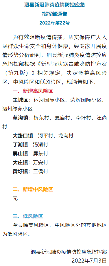 今日,安徽泗縣新冠肺炎疫情防控應(yīng)急指揮部發(fā)布通告,全縣范圍內(nèi)新增13個高風(fēng)險區(qū)。詳情如下:為有效阻斷疫情傳播,切實保障廣大人民群眾生命安全和身體健康,經(jīng)專家開展疫情形勢分析研判,泗縣新冠肺炎疫情防控應(yīng)急指揮部根據(jù)《新型冠狀病毒肺炎防控方案(第九版)》相關(guān)規(guī)定,決定調(diào)整高風(fēng)險區(qū)、中風(fēng)險區(qū)和低風(fēng)險區(qū),現(xiàn)通告如下: