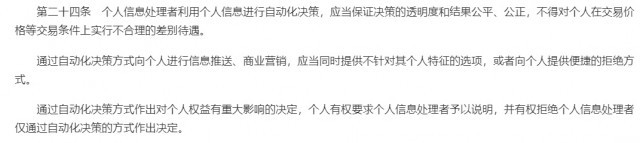 《中華人民共和國個人信息保護法》第24條明確規(guī)定了用戶對自動化決策的拒絕權(quán),即“通過自動化決策方式向個人進行信息推送、商業(yè)營銷,應(yīng)當(dāng)同時提供不針對其個人特征的選項,或者向個人提供便捷的拒絕方式”。