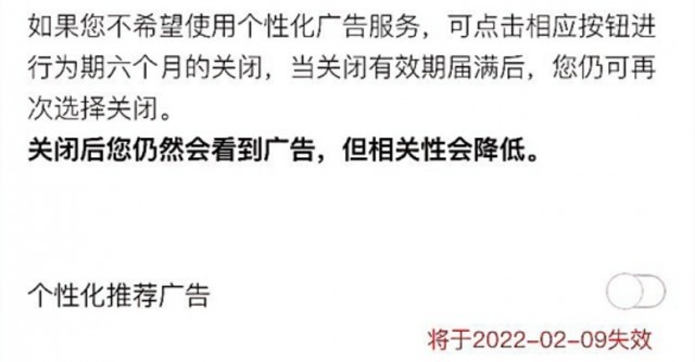 該案當(dāng)事人由于對平臺個性化廣告推薦深感困擾,遂想關(guān)閉該設(shè)置。然而,在進入該平臺個性化廣告推薦關(guān)閉設(shè)置時,發(fā)現(xiàn)卻只能選擇為期六個月的關(guān)閉時間,期滿后將自動恢復(fù)個性化廣告推薦。當(dāng)事人認(rèn)為,平臺在未經(jīng)本人同意的情況下處理個人信息,損害了個人信息權(quán)益,遂將該平臺開發(fā)運營方訴至法院,要求徹底關(guān)閉該平臺個性化廣告推薦。