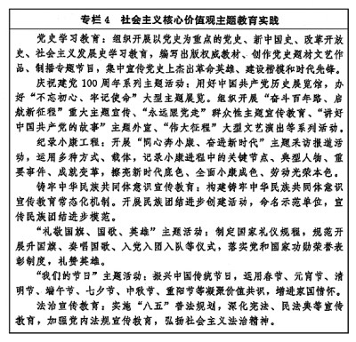 持續(xù)深化社會主義核心價值觀宣傳教育,增進(jìn)認(rèn)知認(rèn)同、樹立鮮明導(dǎo)向、強化示范帶動。堅持貫穿結(jié)合融入、落細(xì)落小落實,把社會主義核心價值觀要求融入日常生活,融入法治建設(shè)。推動理想信念教育常態(tài)化制度化,筑牢黨員干部、青少年等重點群體的理想信念之基。圍繞“七一”、“八一”、“十一”等重大時間節(jié)點,依托革命歷史類紀(jì)念設(shè)施、遺址和愛國主義教育基地等載體,加強愛國主義、集體主義、社會主義教育,弘揚黨和人民在各個歷史時期奮斗中形成的偉大精神。加強公益廣告宣傳。統(tǒng)籌開展誠信教育、勤儉節(jié)約教育、勞動創(chuàng)造幸福主題宣傳教育。強化祖國統(tǒng)一和民族團結(jié)進(jìn)步宣傳教育,深化“一國兩制”實踐教育,強化全民國防教育,促進(jìn)平安中國建設(shè)。