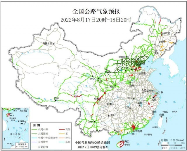 8月17日20時至18日20時,內蒙古中部偏南地區(qū)、遼寧西部、青海東部、甘肅中東部、寧夏、陜西北部、山西北部、河北中北部、北京、天津、廣東西南部等地部分地區(qū)有中到大雨,其中,內蒙古中部偏南地區(qū)、陜西北部、山西北部、河北東北部、北京北部、天津北部等地部分地區(qū)有暴雨,內蒙古中部偏南地區(qū)、山西北部等地部分地區(qū)有大暴雨。河北中南部、黑龍江西北部和南部、浙江西部和東北部、廣東中部、廣西東南部、海南島大部、四川中部、西藏東北部、寧夏南部等地局地有雷暴。另外,遼寧東部、吉林中東部、福建東部、廣西東南部、云南東北部等地局地有霧。受大到暴雨影響的主要路段有: