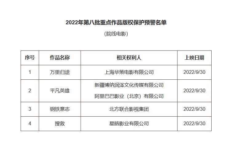 中新網(wǎng)9月30日電 據(jù)國(guó)家版權(quán)局29日消息,2022年度第八批重點(diǎn)作品版權(quán)保護(hù)預(yù)警名單公布,包含院線電影《萬(wàn)里歸途》《平凡英雄》《鋼鐵意志》《搜救》。