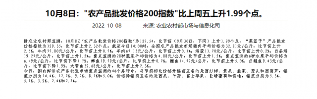 央視網(wǎng)消息:據(jù)農(nóng)業(yè)農(nóng)村部網(wǎng)站,10月8日"農(nóng)產(chǎn)品批發(fā)價(jià)格200指數(shù)"為127.54,比節(jié)前(9月30日,下同)上升1.99個(gè)點(diǎn),“菜籃子”產(chǎn)品批發(fā)價(jià)格指數(shù)為129.35,比節(jié)前上升2.32個(gè)點(diǎn)。截至今日14:00時(shí),全國農(nóng)產(chǎn)品批發(fā)市場(chǎng)豬肉平均價(jià)格為32.81元/公斤,比節(jié)前上升2.5%。