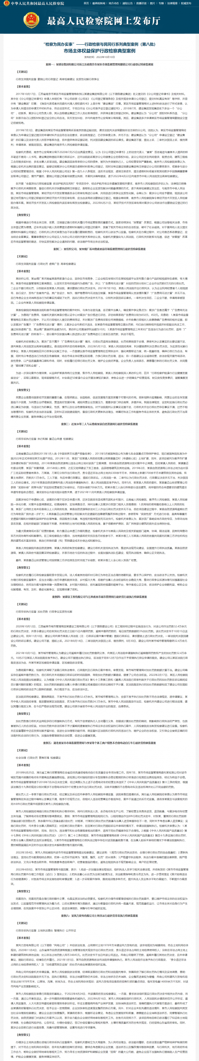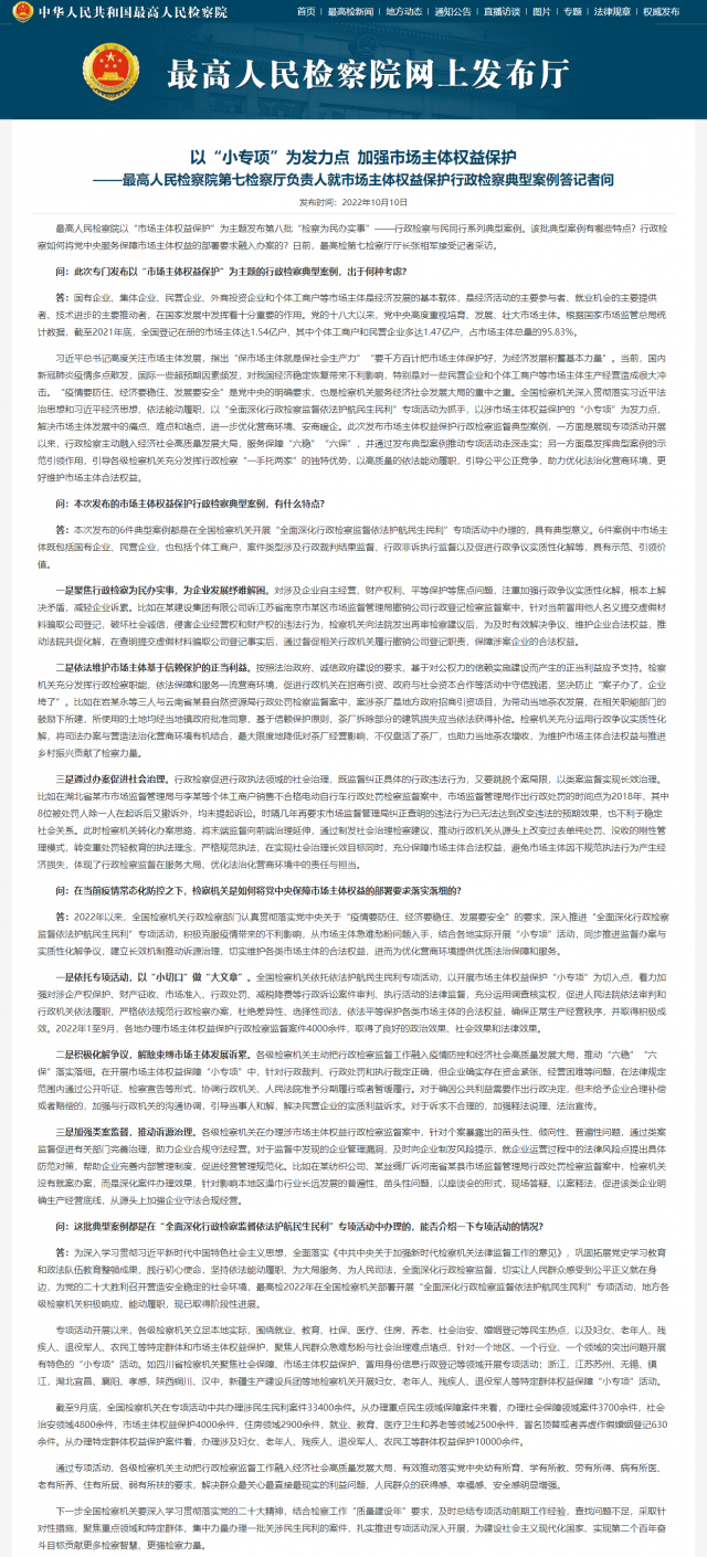 央視網消息:據中華人民共和國最高人民檢察院網站消息,10月10日,最高人民檢察院以“市場主體權益保護”為主題發(fā)布第八批“檢察為民辦實事”——行政檢察與民同行系列典型案例。