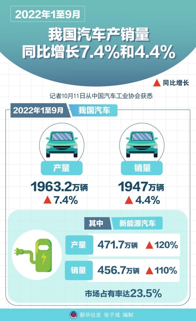 新華社北京10月11日電(記者高亢、戴小河)記者11日從中國(guó)汽車工業(yè)協(xié)會(huì)獲悉,今年1至9月,我國(guó)汽車產(chǎn)銷量分別達(dá)1963.2萬(wàn)輛和1947萬(wàn)輛,同比增長(zhǎng)7.4%和4.4%。其中,新能源汽車產(chǎn)銷量分別達(dá)471.7萬(wàn)輛和456.7萬(wàn)輛,同比增長(zhǎng)120%和110%,市場(chǎng)占有率達(dá)23.5%。