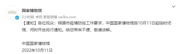 中國國家博物館:根據(jù)疫情防控要求,10月11日起臨時閉館
