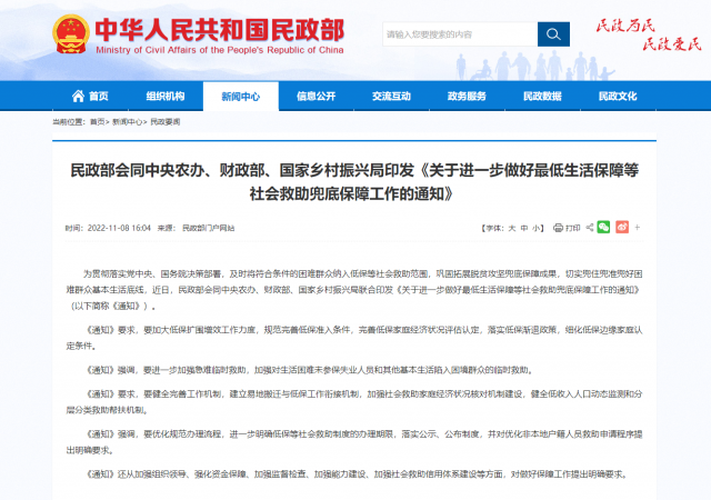 據(jù)民政部網(wǎng)站消息,為貫徹落實黨中央、國務(wù)院決策部署,及時將符合條件的困難群眾納入低保等社會救助范圍,鞏固拓展脫貧攻堅兜底保障成果,切實兜住兜準兜好困難群眾基本生活底線,近日,民政部會同中央農(nóng)辦、財政部、國家鄉(xiāng)村振興局聯(lián)合印發(fā)《關(guān)于進一步做好最低生活保障等社會救助兜底保障工作的通知》(以下簡稱《通知》)。