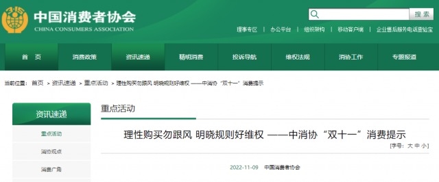 - 中消協(xié)“雙十一”消費(fèi)提示:理性購(gòu)買(mǎi)勿跟風(fēng)