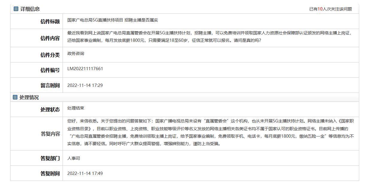 國家廣電總局人事司表示,網(wǎng)絡(luò)主播未納入《國家職業(yè)資格目錄》,目前以職業(yè)資格、上崗資格、職業(yè)技能等級評價(jià)等名義發(fā)放的網(wǎng)絡(luò)主播相關(guān)各類證書均不屬于國家認(rèn)可的職業(yè)資格證書。目前網(wǎng)上傳播的“廣電總局直屬管委會招聘主播,免費(fèi)培訓(xùn)領(lǐng)取主播上崗證,給予國家事業(yè)編制,免費(fèi)領(lǐng)取手機(jī)、電話卡,每月底薪1800元,繳納五險(xiǎn)一金”等信息均為不實(shí)信息。