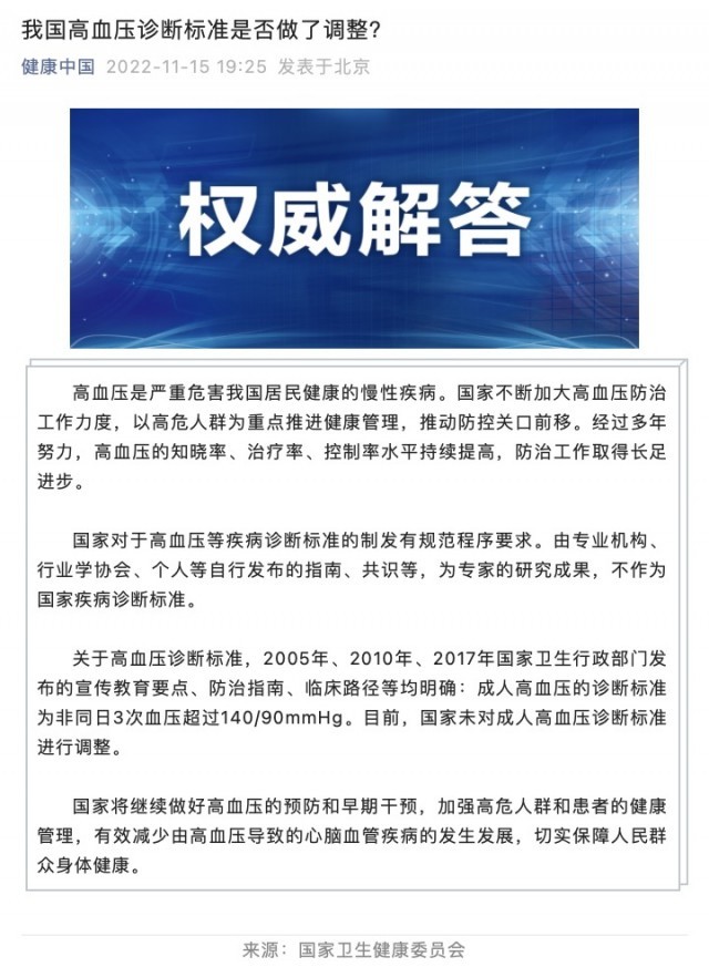 國家衛(wèi)健委:國家未對成人高血壓診斷標準進行調(diào)整