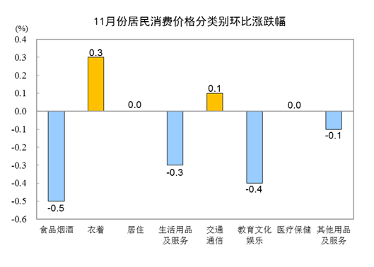 11月份,全國居民消費價格環(huán)比下降0.2%。其中,城市下降0.2%,農(nóng)村下降0.2%;食品價格下降0.8%,非食品價格持平;消費品價格下降0.1%,服務價格下降0.2%。