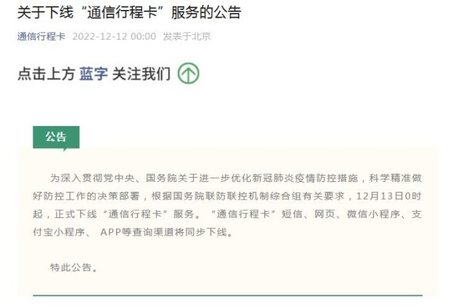 12月13日0時(shí)起,“通信行程卡”服務(wù)將正式下線