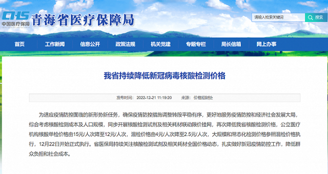 據(jù)青海省醫(yī)療保障局網(wǎng)站消息,為適應(yīng)疫情防控面臨的新形勢新任務(wù),確保疫情防控措施調(diào)整轉(zhuǎn)段平穩(wěn)有序,更好地服務(wù)疫情防控和經(jīng)濟(jì)社會發(fā)展大局,綜合考慮核酸檢測成本及人口規(guī)模,同步開展核酸檢測試劑及相關(guān)耗材聯(lián)動(dòng)限價(jià)掛網(wǎng),再次降低青海省核酸檢測價(jià)格,公立醫(yī)療機(jī)構(gòu)核酸單檢價(jià)格由15元/人次降至12元/人次,混檢價(jià)格由4元/人次降至2.5元/人次,大規(guī)模和常態(tài)化檢測價(jià)格參照混檢價(jià)格執(zhí)行,12月22日開始正式執(zhí)行。省醫(yī)保局持續(xù)關(guān)注核酸檢測試劑及相關(guān)耗材全國價(jià)格動(dòng)態(tài),扎實(shí)做好新冠疫情防控工作,降低群眾負(fù)擔(dān)和社會成本。