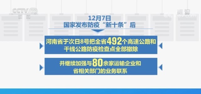 據(jù)了解,12月7日,國家發(fā)布防疫“新十條”后,河南省于次日把全省492個(gè)高速公路和干線公路防疫檢查點(diǎn)全部撤除,并繼續(xù)加強(qiáng)與80余家運(yùn)輸企業(yè)和省相關(guān)部門的業(yè)務(wù)聯(lián)系,充分發(fā)揮“12328服務(wù)監(jiān)督熱線+三級(jí)調(diào)度”機(jī)制作用,每日收集運(yùn)輸受阻問題,以便及時(shí)解決問題。