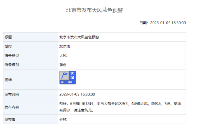 央視網(wǎng)消息:據(jù)北京氣象局網(wǎng)站消息,2023年01月05日16時30分,北京市氣象臺發(fā)布大風(fēng)藍色預(yù)警。