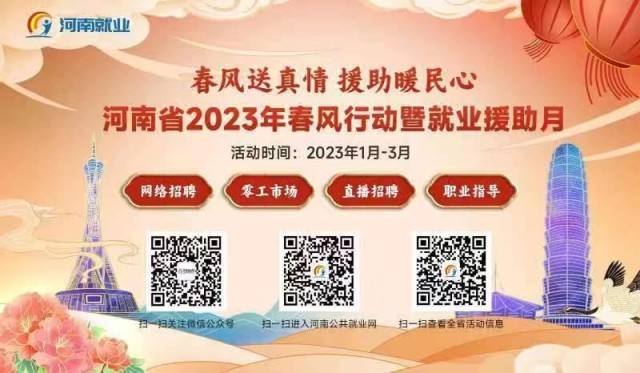 近日,人力資源社會(huì)保障部推出的2023年春風(fēng)行動(dòng)暨就業(yè)援助月活動(dòng)正在各地火熱開展。今年,多地還出現(xiàn)了直播帶崗這一新的招聘會(huì)模式。人社部將及時(shí)發(fā)布各地的活動(dòng)情況,送崗位到勞動(dòng)者身邊。大家可以通過掃描下方二維碼,進(jìn)入網(wǎng)站鏈接或微信小程序進(jìn)行查看。