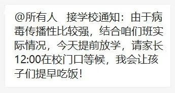 今天(2月20日)早上,一張截圖在部分金華市民朋友圈中傳播。金華一學(xué)校發(fā)布了提前放學(xué)通知:“由于病毒傳播性比較強(qiáng),結(jié)合咱們班實(shí)際情況,今天提前放學(xué),請家長12:00在校門口等候?!?/p>