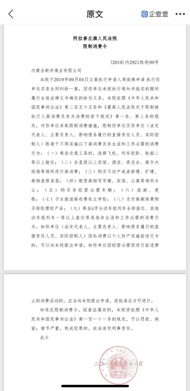 據(jù)了解,內蒙古新井煤業(yè)有限公司于1999年登記成立,企查查平臺顯示,該公司多次涉及買賣合同糾紛、租賃合同糾紛、借款合同糾紛等,后被法院列為失信被執(zhí)行人,公司法定代表人也曾多次被法院限制高消費。