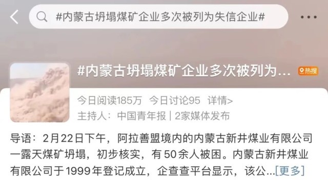 2月22日,內蒙古阿拉善盟阿拉善左旗新井煤業(yè)有限公司一露天煤礦發(fā)生大面積坍塌,有工作人員和車輛被埋。