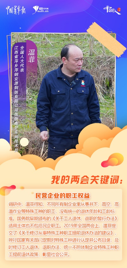 民營企業(yè)的職工權益,一直是溫菲關注的焦點。調研中,溫菲得知,不同所有制企業(yè)里從事井下、高空、高溫作業(yè)等特殊工種的職工,沒有統(tǒng)一的退休年齡和工齡標準。國務院早期頒布的《關于工人退休、退職的暫行辦法》適用主體也不包括民企職工。2019年全國兩會上,溫菲提交了《關于修訂從事特殊工種職工提前退休辦法的建議》,呼吁國家有關部門定期對特殊工種進行認定并公布目錄,及時修訂工人退休、退職辦法,統(tǒng)一不同體制企業(yè)特殊工種職工提前退休政策,彰顯社會公平。