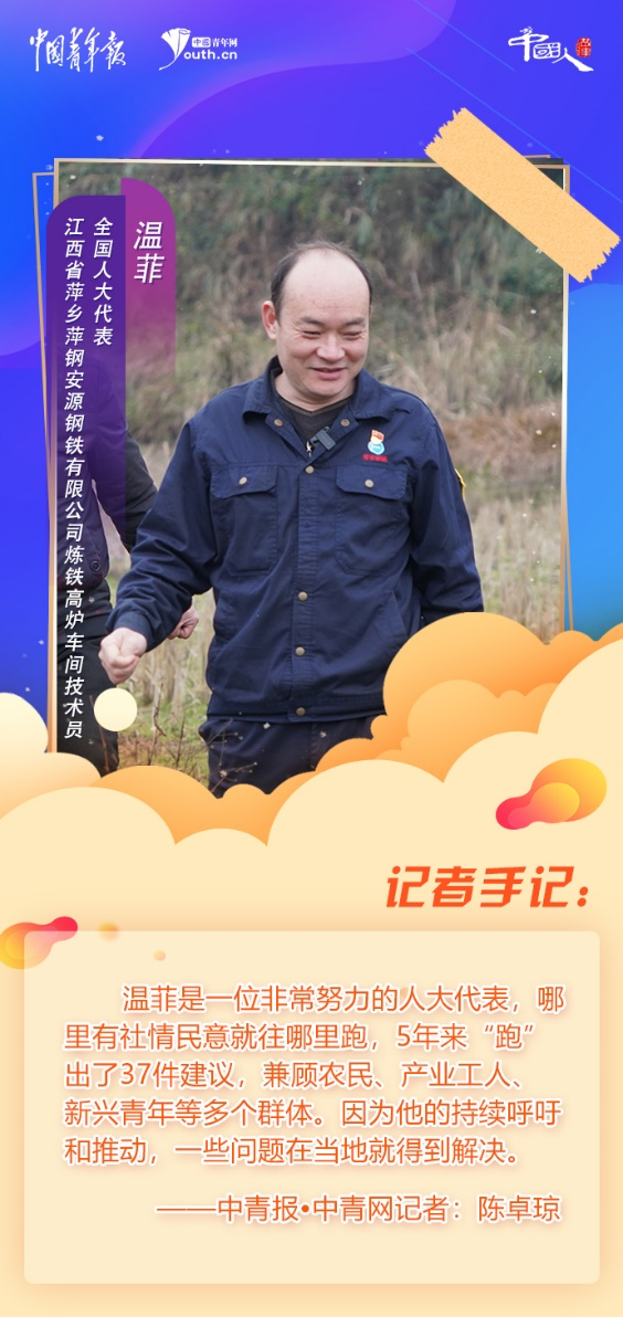 溫菲是一位非常努力的人大代表,哪里有社情民意就往哪里跑,5年來“跑”出了37件建議,兼顧農(nóng)民、產(chǎn)業(yè)工人、新興青年等多個群體。因為他的持續(xù)呼吁和推動,一些問題在當?shù)鼐偷玫浇鉀Q。