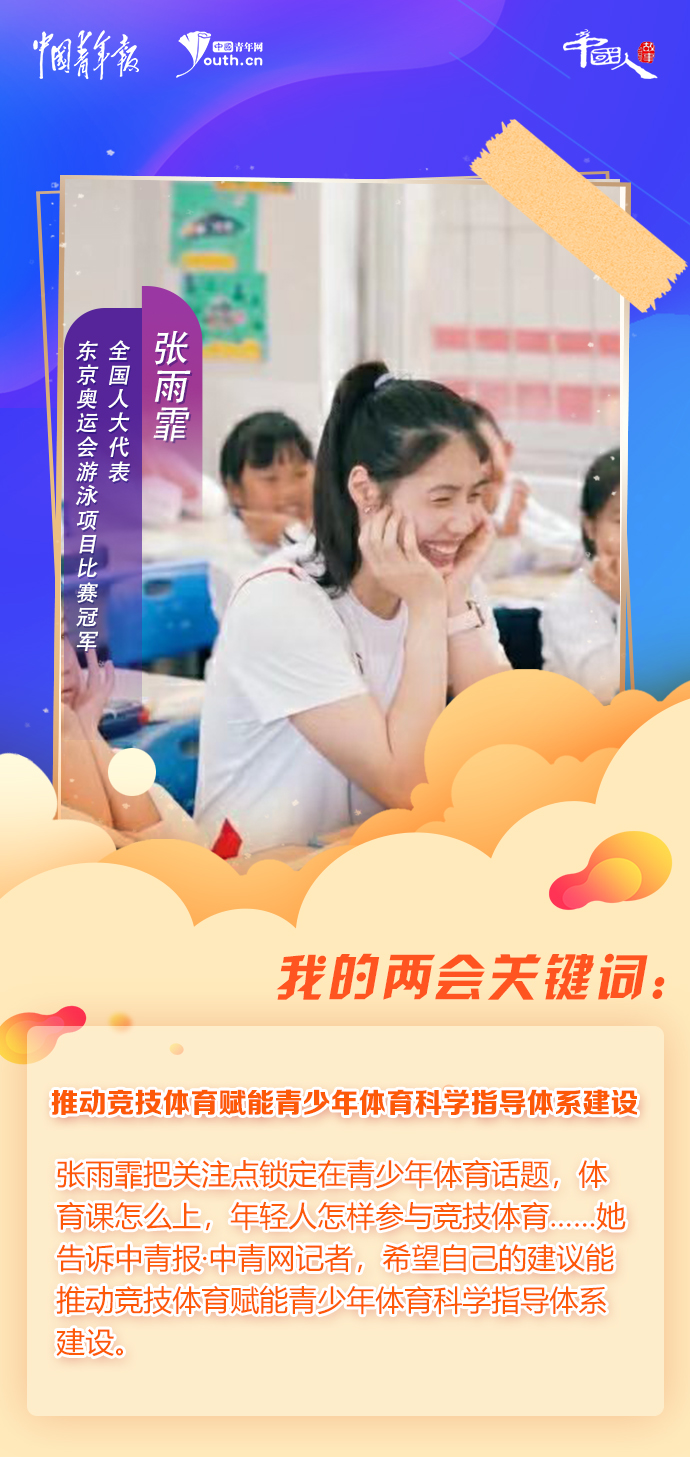 生于1998年的張雨霏在東京奧運(yùn)會(huì)游泳項(xiàng)目比賽中斬獲兩金兩銀,是新當(dāng)選的全國人大代表。最近幾天,25歲的她正忙著完善自己的建議。