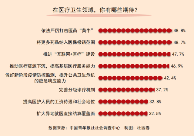 在醫(yī)療衛(wèi)生領(lǐng)域,大家有哪些期待?調(diào)查顯示,依法嚴(yán)厲打擊醫(yī)藥“黃牛”(48.8%)的呼聲最高,其次是將更多藥品納入醫(yī)保報(bào)銷范圍(48.7%),然后是:推進(jìn)“互聯(lián)網(wǎng)+醫(yī)療”建設(shè)(47.7%)和推動醫(yī)療資源下沉,提高基層醫(yī)療服務(wù)能力(46.9%)。