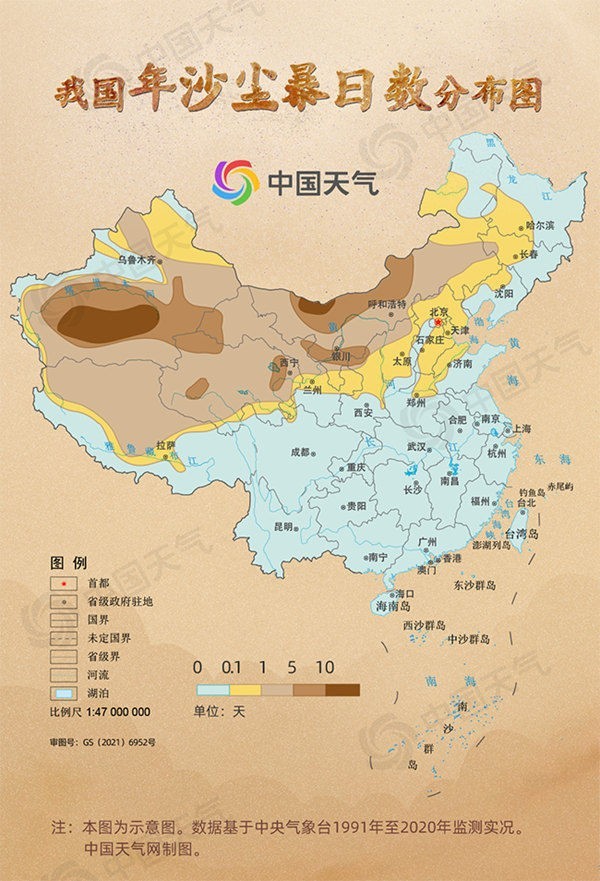 記者統(tǒng)計1991年至2020年來,我國沙塵暴日數(shù)的分布情況,可以看出沙塵天氣主要影響我國北方地區(qū),其中,南疆盆地和內(nèi)蒙古西部兩地是沙塵暴的高發(fā)區(qū),年沙塵暴日數(shù)在10天以上,部分地區(qū)超過20天。