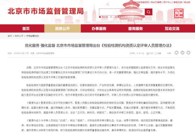 北京市市場監(jiān)督管理局出臺(tái)《檢驗(yàn)檢測機(jī)構(gòu)資質(zhì)認(rèn)定評(píng)審人員管理辦法》