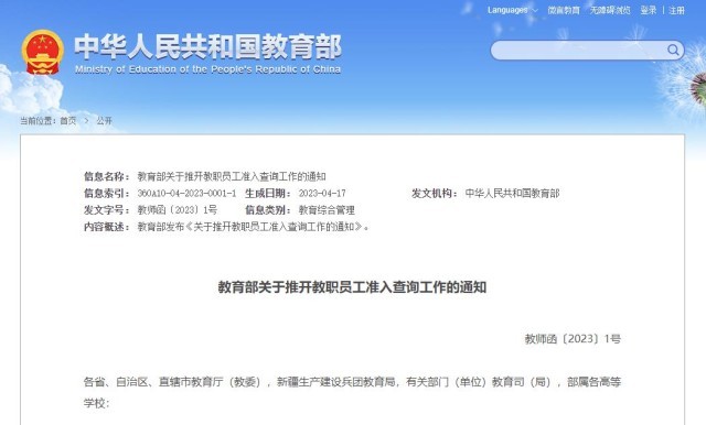 為深入貫徹黨的二十大精神,加強師德師風建設,凈化校園環(huán)境,根據(jù)《中華人民共和國刑法》《中華人民共和國刑事訴訟法》《中華人民共和國未成年人保護法》《中華人民共和國治安管理處罰法》《中華人民共和國教師法》《中華人民共和國高等教育法》《中華人民共和國勞動合同法》等法律規(guī)定,按照最高人民檢察院、教育部、公安部《關于建立教職員工準入查詢性侵違法犯罪信息制度的意見》(高檢發(fā)〔2020〕14號)和最高人民法院、最高人民檢察院、教育部《關于落實從業(yè)禁止制度的意見》(法發(fā)〔2022〕32號)要求,加強教職員工管理,建立健全教職員工準入查詢制度,教育部決定在前期試點實施基礎上,推開教職員工準入查詢工作,推進教職員工準入查詢平臺(以下簡稱查詢平臺)上線使用。現(xiàn)將有關事宜通知如下。