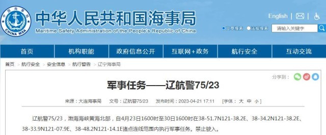 大連海事局發(fā)布航行警告,4月23日16時(shí)至30日16時(shí),渤海海峽黃海北部執(zhí)行軍事任務(wù),禁止駛?cè)搿?/p>