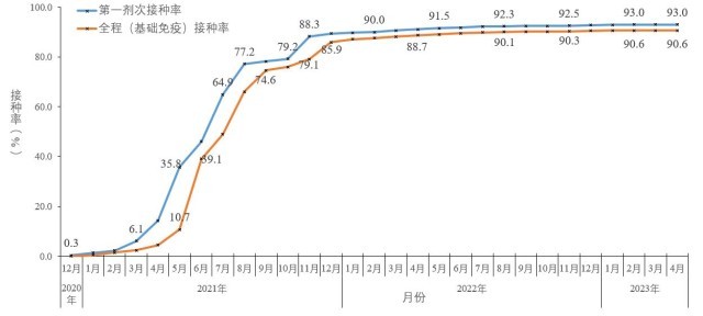 截至2023年4月20日,31個(gè)?。ㄗ灾螀^(qū)、直轄市)和新疆生產(chǎn)建設(shè)兵團(tuán)累計(jì)報(bào)告接種新冠病毒疫苗349443.2萬(wàn)劑次(圖5-1)。接種總?cè)藬?shù)131048.0萬(wàn)人,完成全程接種127708.4萬(wàn)人,完成第一劑次加強(qiáng)免疫接種82783.9萬(wàn)人。全人群第一劑次、全程接種覆蓋比例分別達(dá)到93.0%和90.6%(圖5-2)。60歲以上老年人累計(jì)報(bào)告接種新冠病毒疫苗68083.7萬(wàn)劑次,接種總?cè)藬?shù)24169.3萬(wàn)人,完成全程接種23036.1萬(wàn)人,完成第一劑次加強(qiáng)免疫接種19318.9萬(wàn)人。