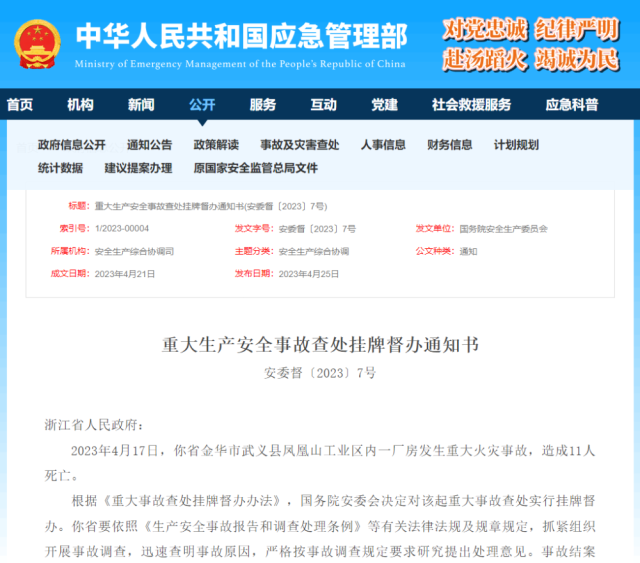 2023年4月17日,你省金華市武義縣鳳凰山工業(yè)區(qū)內(nèi)一廠房發(fā)生重大火災事故,造成11人死亡。