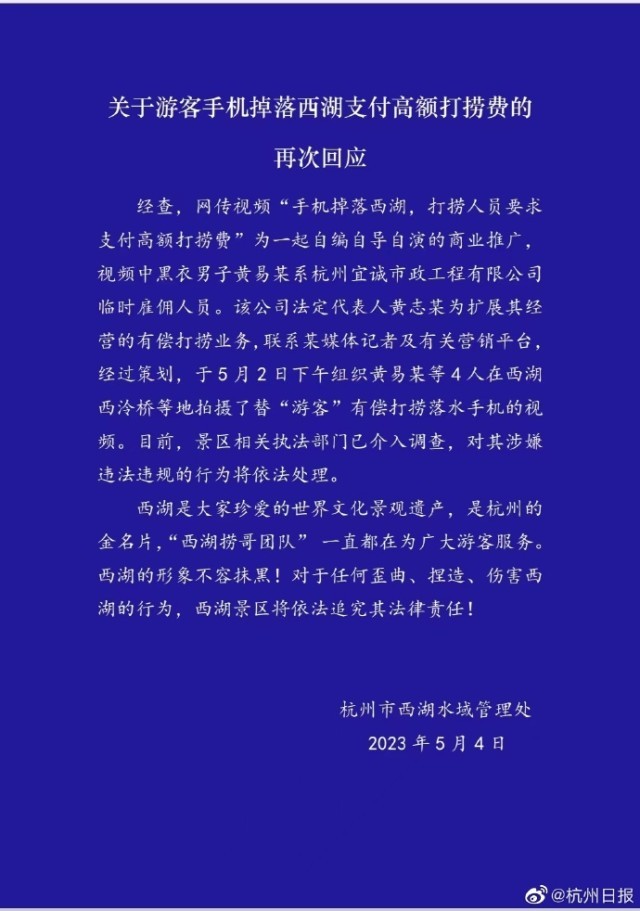 5月4日,杭州西湖水域管理處再次回應(yīng)“高價撈手機事件”:經(jīng)查,網(wǎng)傳視頻“手機掉落西湖,打撈人員要求支付高額打撈費”為一起自編自導自演的商業(yè)推廣,視頻中黑衣男子黃易某系杭州宜誠市政工程有限公司臨時雇傭人員。該公司法定代表人黃志某為擴展其經(jīng)營的有償打撈業(yè)務(wù),聯(lián)系某媒體記者及有關(guān)營銷平臺經(jīng)過策劃,于5月2日下午組織黃易某等4人在西湖西冷橋等地拍攝了替“游客”有償打撈落水手機的視頻。目前,景區(qū)相關(guān)執(zhí)法部門已介入調(diào)查,對其涉嫌違法違規(guī)的行為將依法處理。西湖是大家珍愛的世界文化景觀遺產(chǎn),是杭州的金名片,“西湖撈哥團隊”一直都在為廣大游客服務(wù)。西湖的形象不容抹黑!對于任何歪曲、捏造、傷害西湖的行為,西湖景區(qū)將依法追究其法律責任!