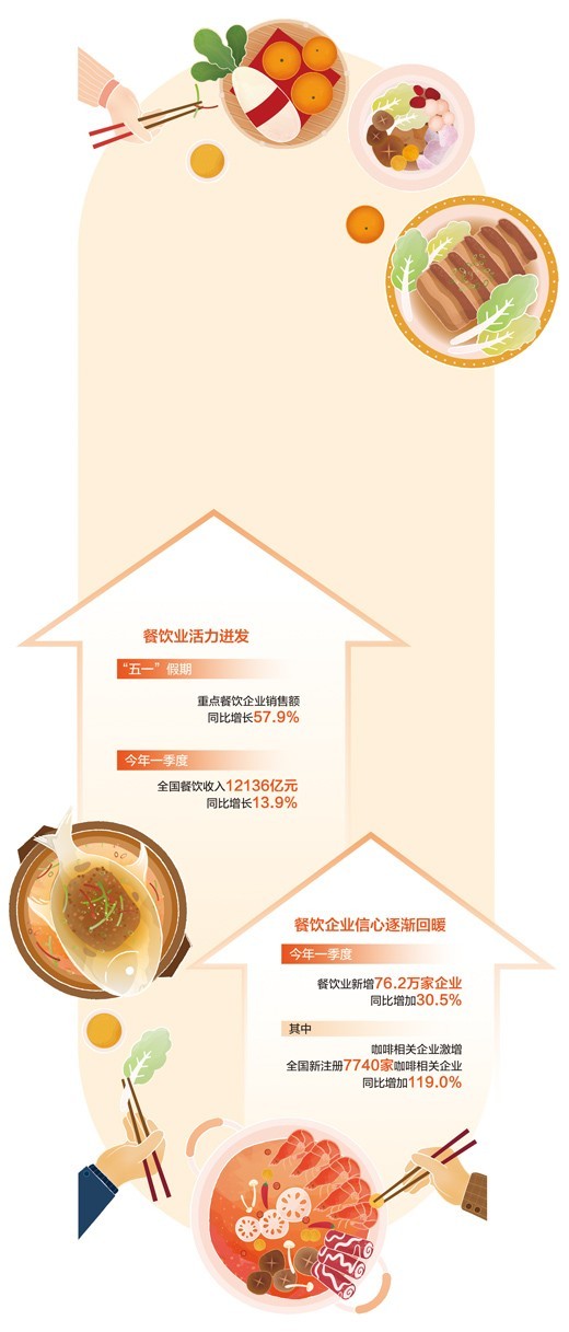 餐飲業(yè)是促消費、惠民生、穩(wěn)就業(yè)的重點領域。今年以來,餐飲消費一直呈現(xiàn)加快恢復向好態(tài)勢,一季度全國餐飲收入同比增長13.9%,餐飲業(yè)新增企業(yè)數(shù)同比增加30.5%。餐飲業(yè)加快恢復向好、持續(xù)激發(fā)活力,為恢復和擴大消費提供有力支撐。