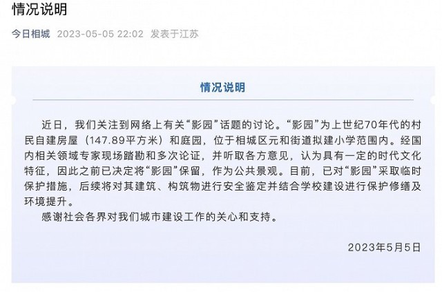 央視網(wǎng)消息:蘇州相城區(qū)委宣傳部公眾號“今日相城”5月5日發(fā)布情況說明稱,近日關(guān)注到網(wǎng)絡(luò)上有關(guān)“影園”話題的討論?!坝皥@”為上世紀(jì)70年代的村民自建房屋(147.89平方米)和庭園,位于相城區(qū)元和街道擬建小學(xué)范圍內(nèi)。經(jīng)國內(nèi)相關(guān)領(lǐng)域?qū)<椰F(xiàn)場踏勘和多次論證,并聽取各方意見,認為具有一定的時代文化特征,因此之前已決定將“影園”保留,作為公共景觀。目前,已對“影園”采取臨時保護措施,后續(xù)將對其建筑、構(gòu)筑物進行安全鑒定并結(jié)合學(xué)校建設(shè)進行保護修繕及環(huán)境提升。