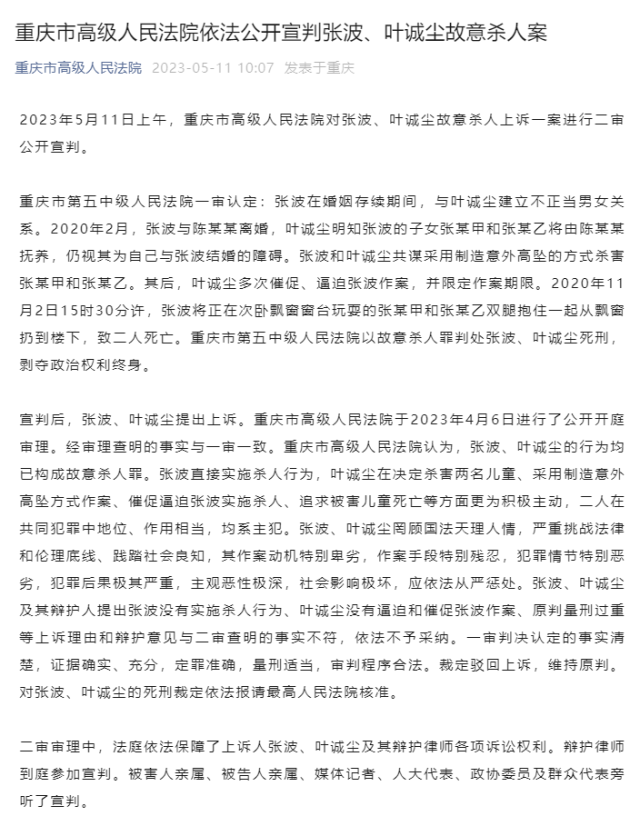 宣判后,張波、葉誠塵提出上訴。重慶市高級人民法院于2023年4月6日進行了公開開庭審理。經審理查明的事實與一審一致。重慶市高級人民法院認為,張波、葉誠塵的行為均已構成故意殺人罪。張波直接實施殺人行為,葉誠塵在決定殺害兩名兒童、采用制造意外高墜方式作案、催促逼迫張波實施殺人、追求被害兒童死亡等方面更為積極主動,二人在共同犯罪中地位、作用相當,均系主犯。張波、葉誠塵罔顧國法天理人情,嚴重挑戰(zhàn)法律和倫理底線、踐踏社會良知,其作案動機特別卑劣,作案手段特別殘忍,犯罪情節(jié)特別惡劣,犯罪后果極其嚴重,主觀惡性極深,社會影響極壞,應依法從嚴懲處。張波、葉誠塵及其辯護人提出張波沒有實施殺人行為、葉誠塵沒有逼迫和催促張波作案、原判量刑過重等上訴理由和辯護意見與二審查明的事實不符,依法不予采納。一審判決認定的事實清楚,證據確實、充分,定罪準確,量刑適當,審判程序合法。裁定駁回上訴,維持原判。對張波、葉誠塵的死刑裁定依法報請最高人民法院核準。