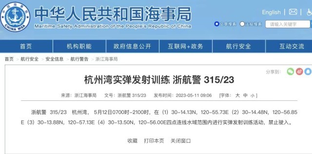 據(jù)中國海事局網站消息,浙江海事局發(fā)布航行警告,5月12日7時至21時,杭州灣部分水域進行實彈發(fā)射訓練活動,禁止駛入。