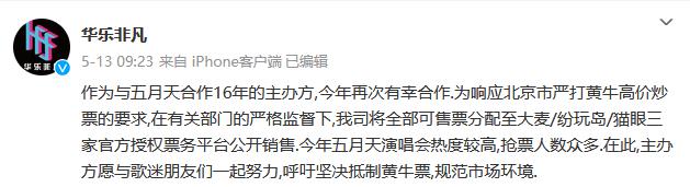 5月13日,華樂非凡在官方微博發(fā)布聲明,五月天演唱會全部可售票是在有關部門的嚴格監(jiān)督下,分配至官方授權票務平臺公開銷售。然而對于這則聲明粉絲們并不買賬,評論區(qū)里有粉絲詢問“不可售”的票去哪兒了?