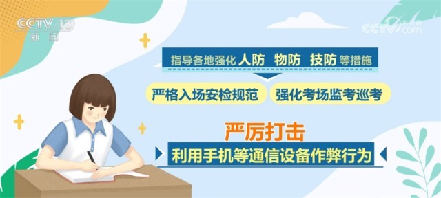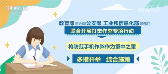 同時,會同公安部、工業(yè)和信息化部等部門聯(lián)合開展打擊作弊專項行動,將防范手機作弊作為重中之重,多措并舉、綜合施策,指導(dǎo)各地強化人防、物防、技防等措施,嚴格入場安檢規(guī)范,強化考場監(jiān)考巡考,嚴厲打擊利用手機等通信設(shè)備作弊行為。對于在高考中存在作弊行為的考生和人員,將依法依規(guī)嚴肅處理,堅決維護高考的公平公正。