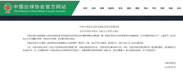 中國臺(tái)球協(xié)會(huì):將從嚴(yán)處罰旅英涉賭球員 開展全行業(yè)警示教育