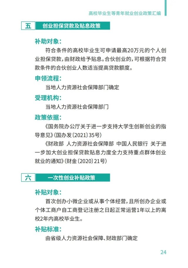 《匯編》系統(tǒng)梳理了國(guó)家有關(guān)部門出臺(tái)的促進(jìn)高校畢業(yè)生就業(yè)創(chuàng)業(yè)現(xiàn)行政策,聚焦高校畢業(yè)生求職就業(yè)需求,分為企業(yè)就業(yè)、基層就業(yè)、自主創(chuàng)業(yè)、能力提升、應(yīng)征入伍、就業(yè)見習(xí)、就業(yè)服務(wù)、就業(yè)手續(xù)、權(quán)益維護(hù)等九方面內(nèi)容。為便于高校畢業(yè)生和企業(yè)快速查閱相關(guān)政策,《匯編》還歸納整理了就業(yè)有關(guān)政策清單,包括6項(xiàng)面向企業(yè)(單位)吸納高校畢業(yè)生就業(yè)的補(bǔ)貼、稅收優(yōu)惠等政策,以及9項(xiàng)面向高校畢業(yè)生的補(bǔ)貼、資助等政策。