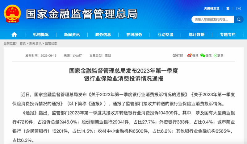 近日,國家金融監(jiān)督管理總局發(fā)布《關(guān)于2023年第一季度銀行業(yè)消費投訴情況的通報》《關(guān)于2023年第一季度保險消費投訴情況的通報》(以下簡稱《通報》),通報了監(jiān)管部門接收并轉(zhuǎn)送的銀行業(yè)保險業(yè)消費投訴情況。