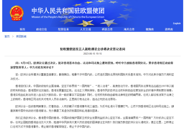 央視網(wǎng)消息:據(jù)中國駐歐盟使團網(wǎng)站消息,駐歐盟使團發(fā)言人就歐洲議會涉港決議答記者問。