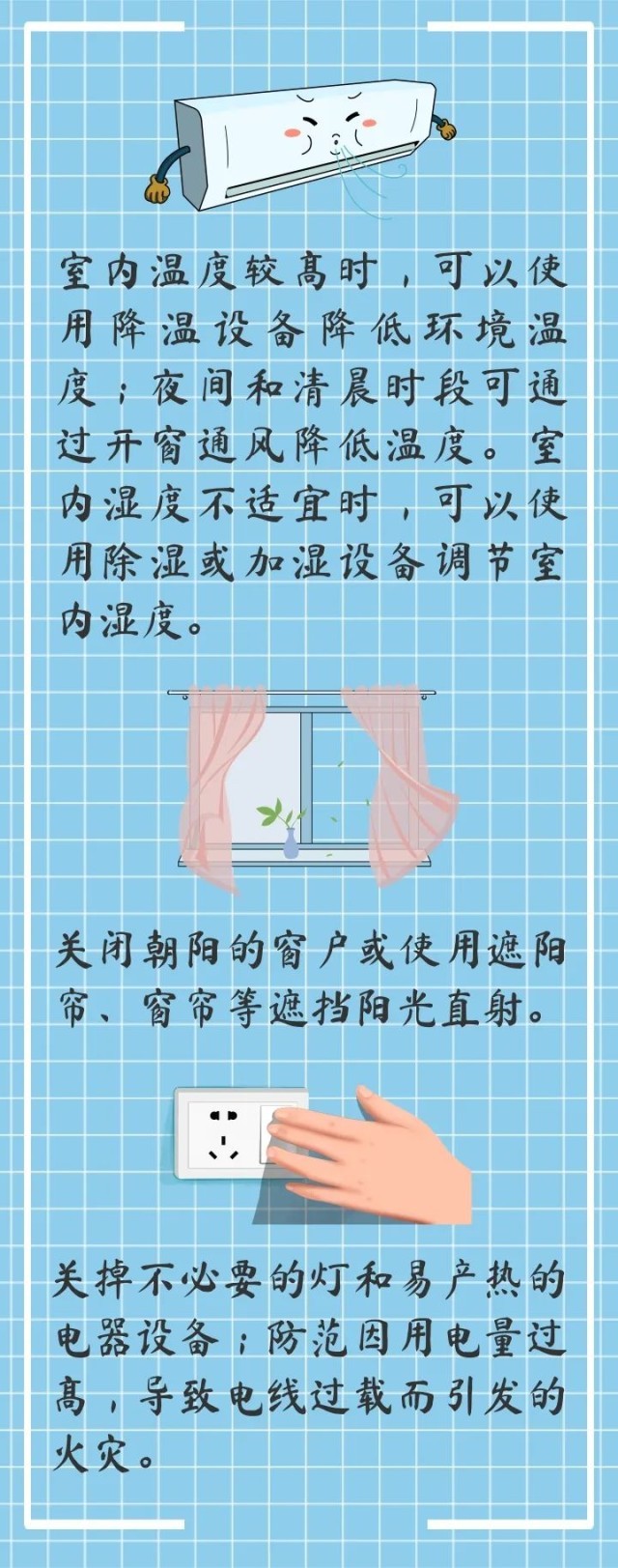 在陰涼處活動(dòng)。盡量避免高溫環(huán)境與太陽(yáng)直射,宜在陰涼處活動(dòng)。