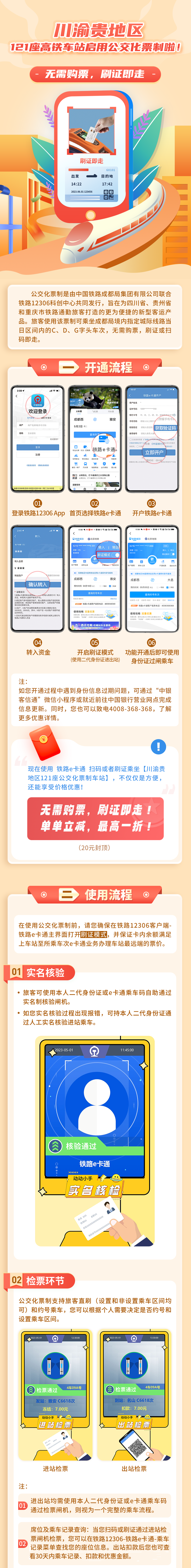 為進(jìn)一步提升通勤旅客出行體驗,中國鐵路成都局集團(tuán)有限公司管內(nèi)的川渝貴地區(qū)121座高鐵車站啟用公交化票制。已開通鐵路e卡通的旅客在鐵路12306客戶端-鐵路e卡通主頁,啟用刷證模式,即可使用二代身份證或e卡通乘車碼,實現(xiàn)無需購票,刷證或掃碼即走。